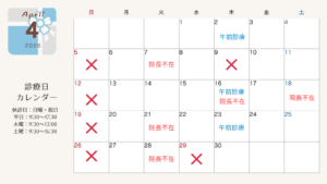 4月の診療日程です。 院長不在日は4/7(火)、16(火)、18(土)、21(火)、28(火) また、日曜祝日、4/9(木)は休診です。