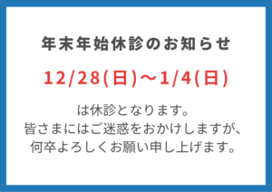年末年始は12/28(日)〜1/4(日)まで休診となります。